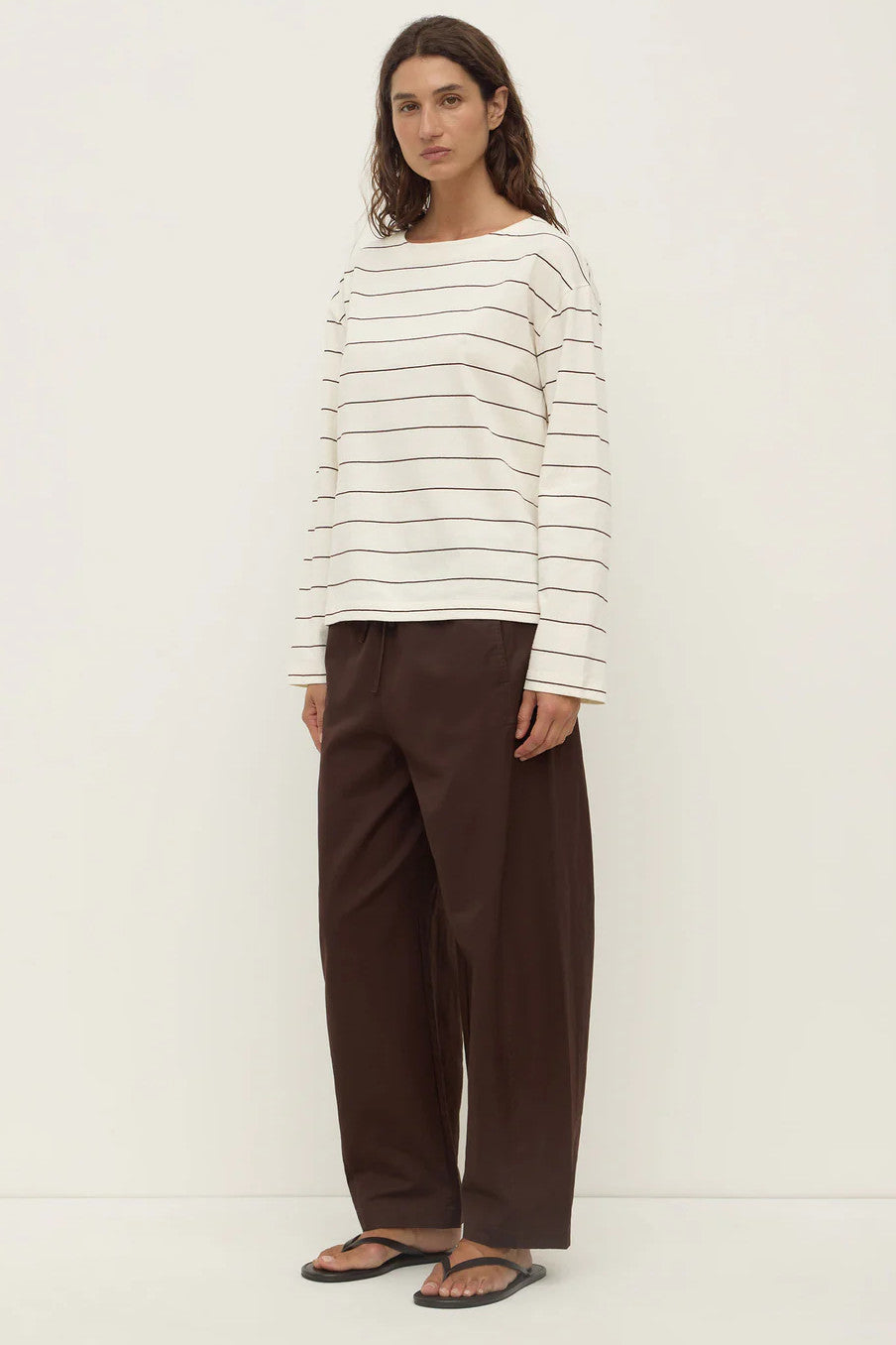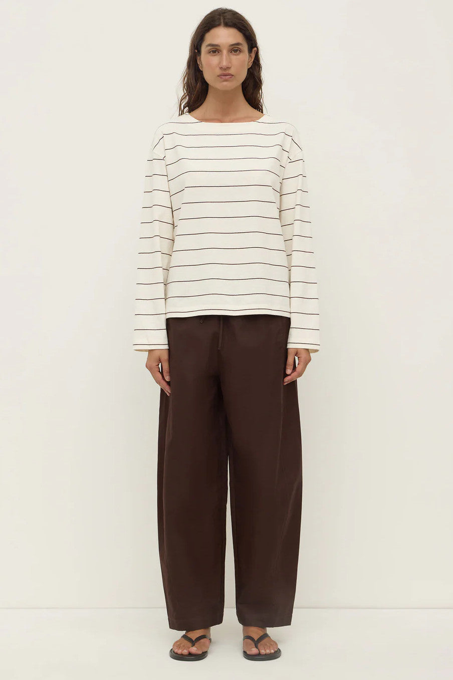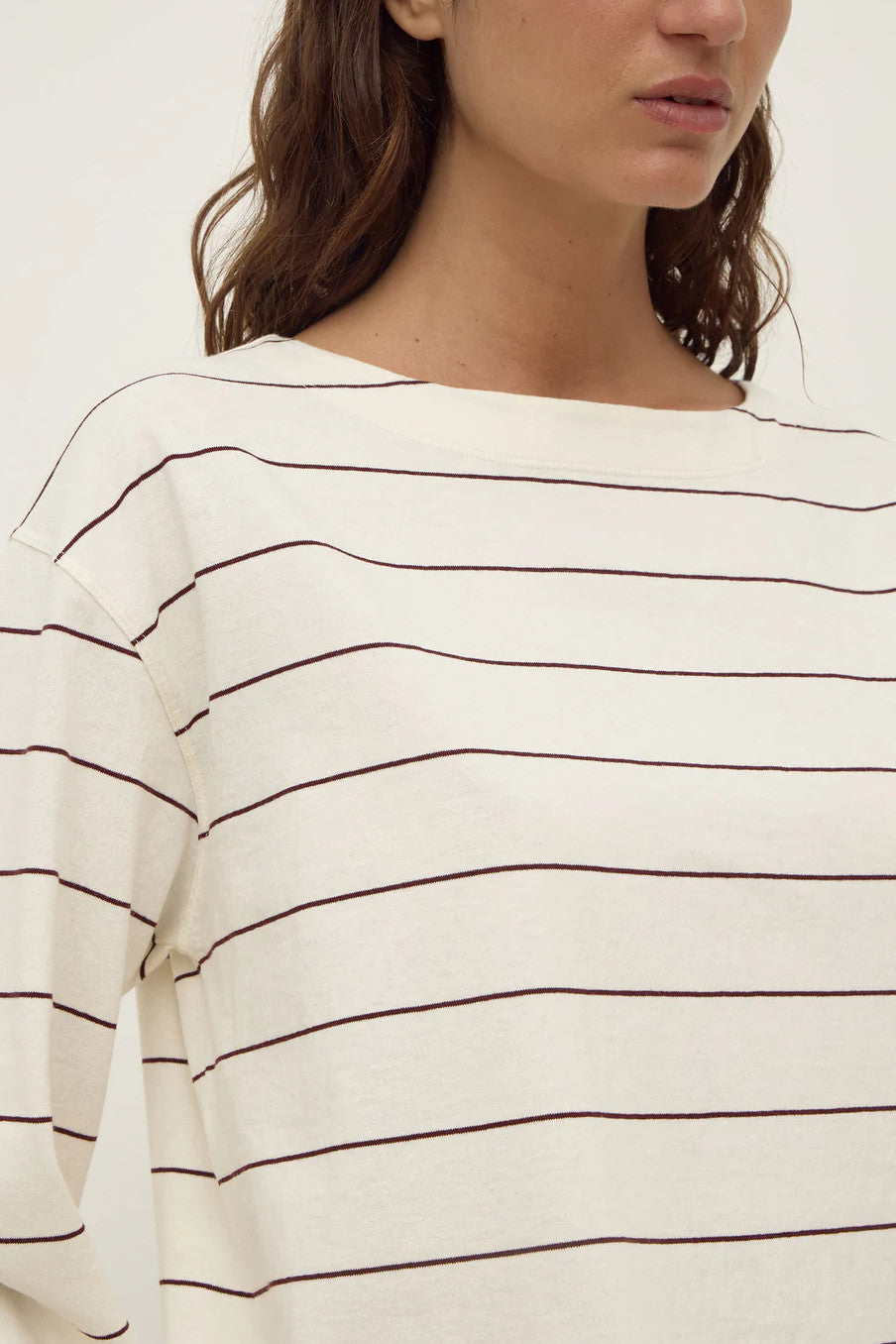 A relaxed long sleeve tee in a classic stripe colourway, with a flattering boat neckline and subtle flare at the sleeves for effortless everyday style. Crafted from breathable cotton, it’s perfect for casual wear or layering under jackets.