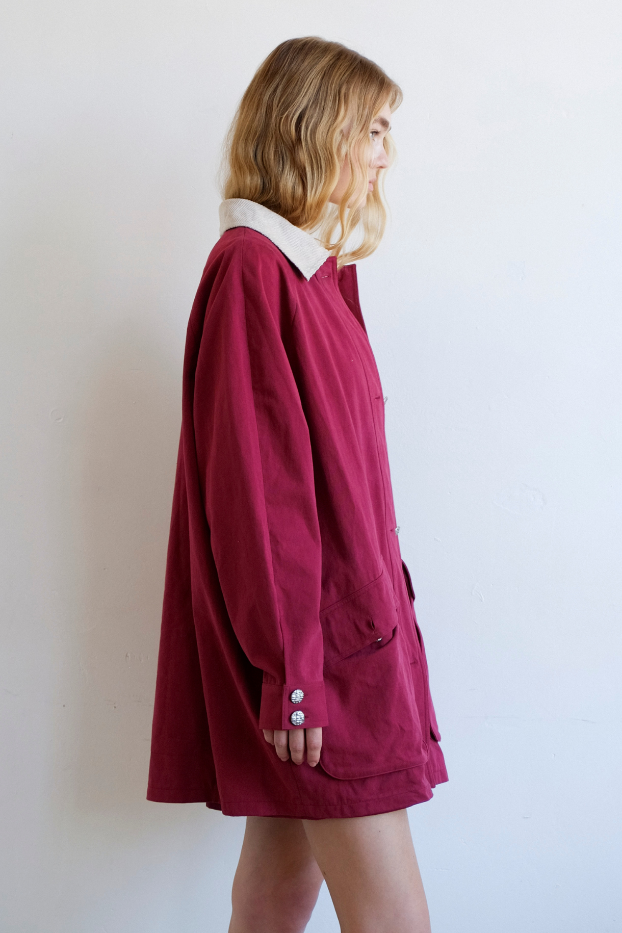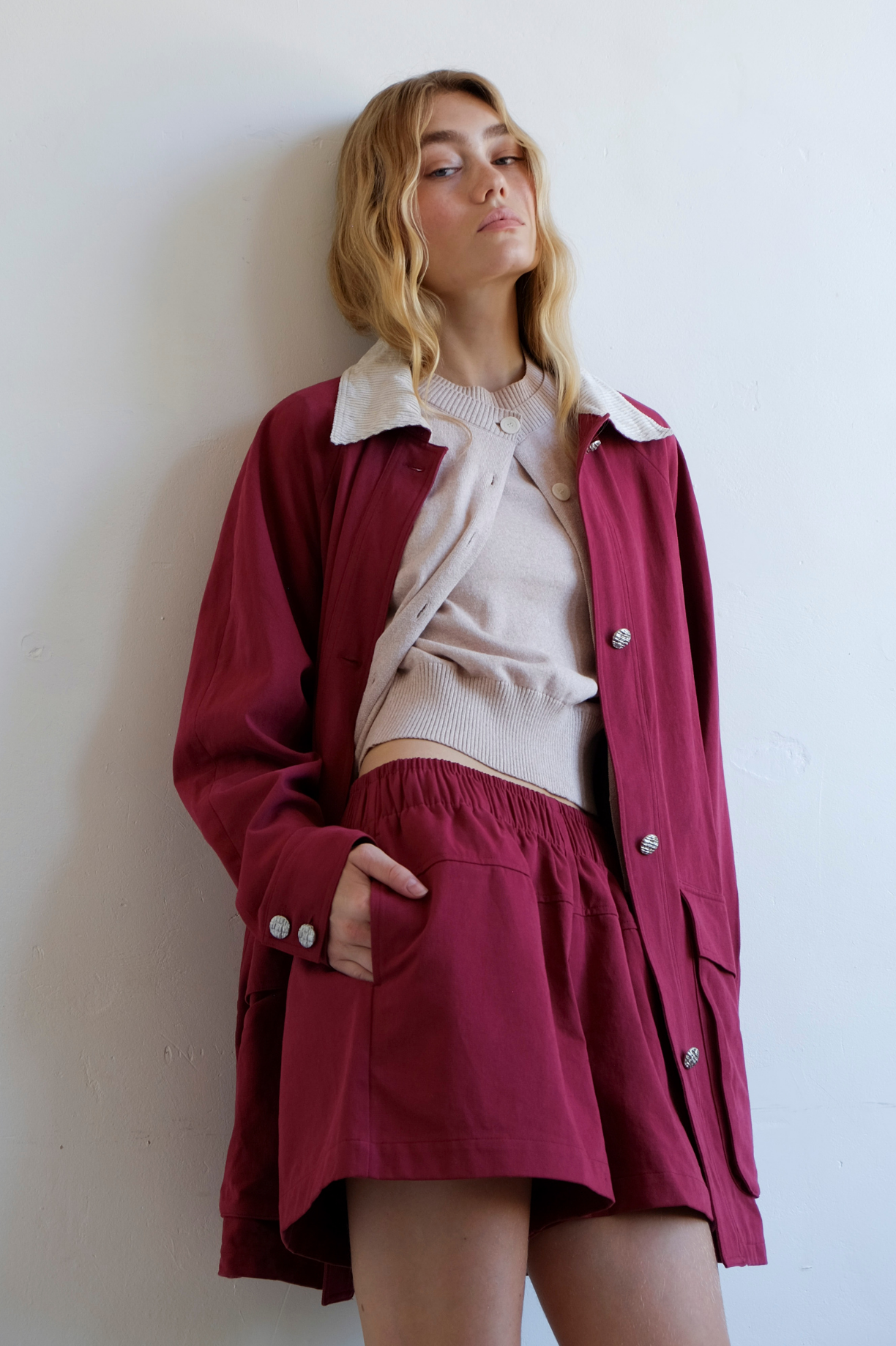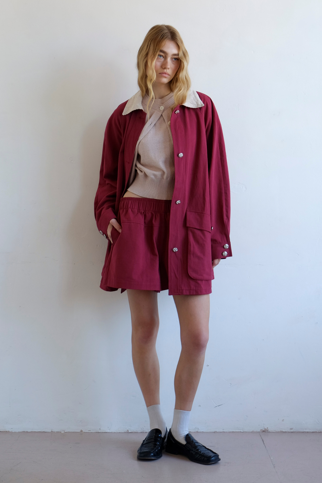 A structured cotton take on the barn jacket in a deep maroon shade. Balancing utility and refinement, it offers an easy statement for trans-seasonal dressing.