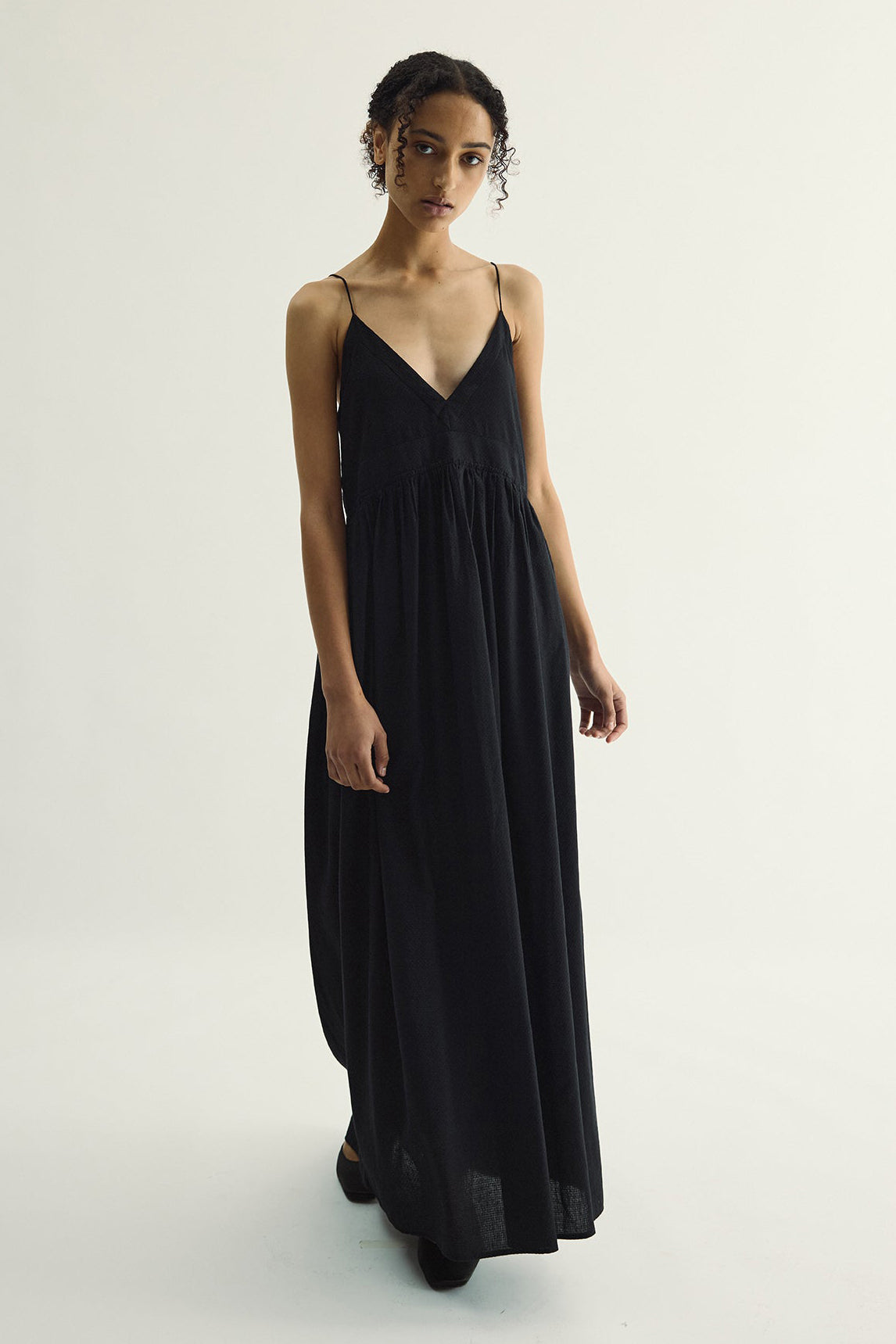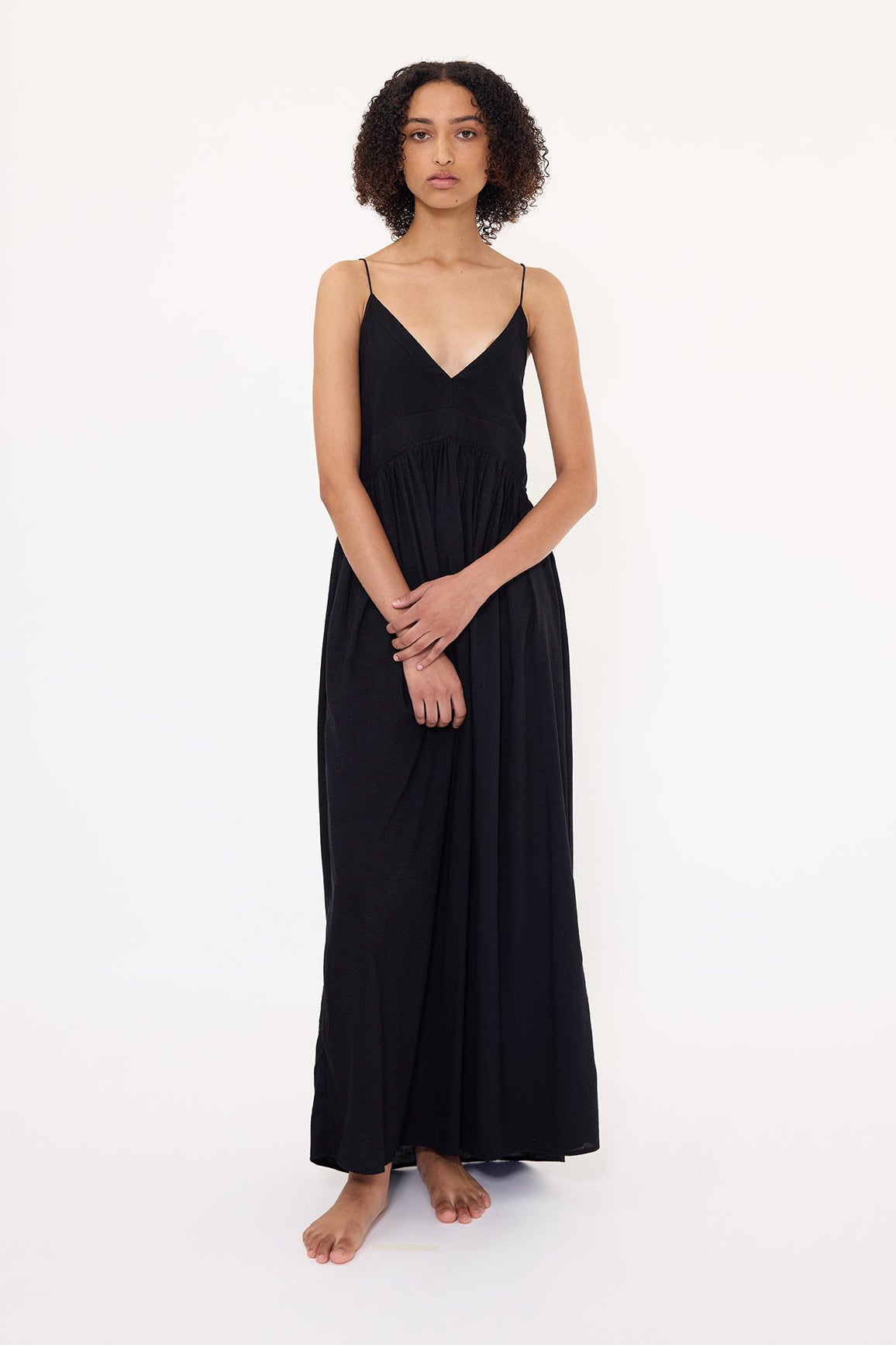 The Frances Dress is crafted from lightweight 100% cotton with a subtle textured finish. Designed with panel detailing through the bodice, a low V-neckline, and fine shoulder straps, it falls into a softly gathered full-length skirt. Side seam pockets add ease and functionality.