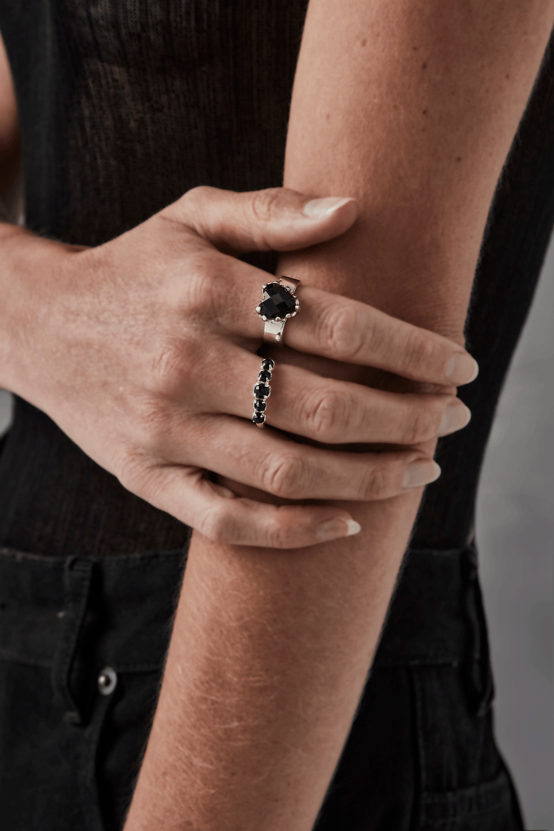 This elegant statement ring is adorned with delicate onyx stone clusters secured in a sterling silver setting. The Halo Cluster Ring can be worn styled in a layered stack or worn as a solo feature piece.