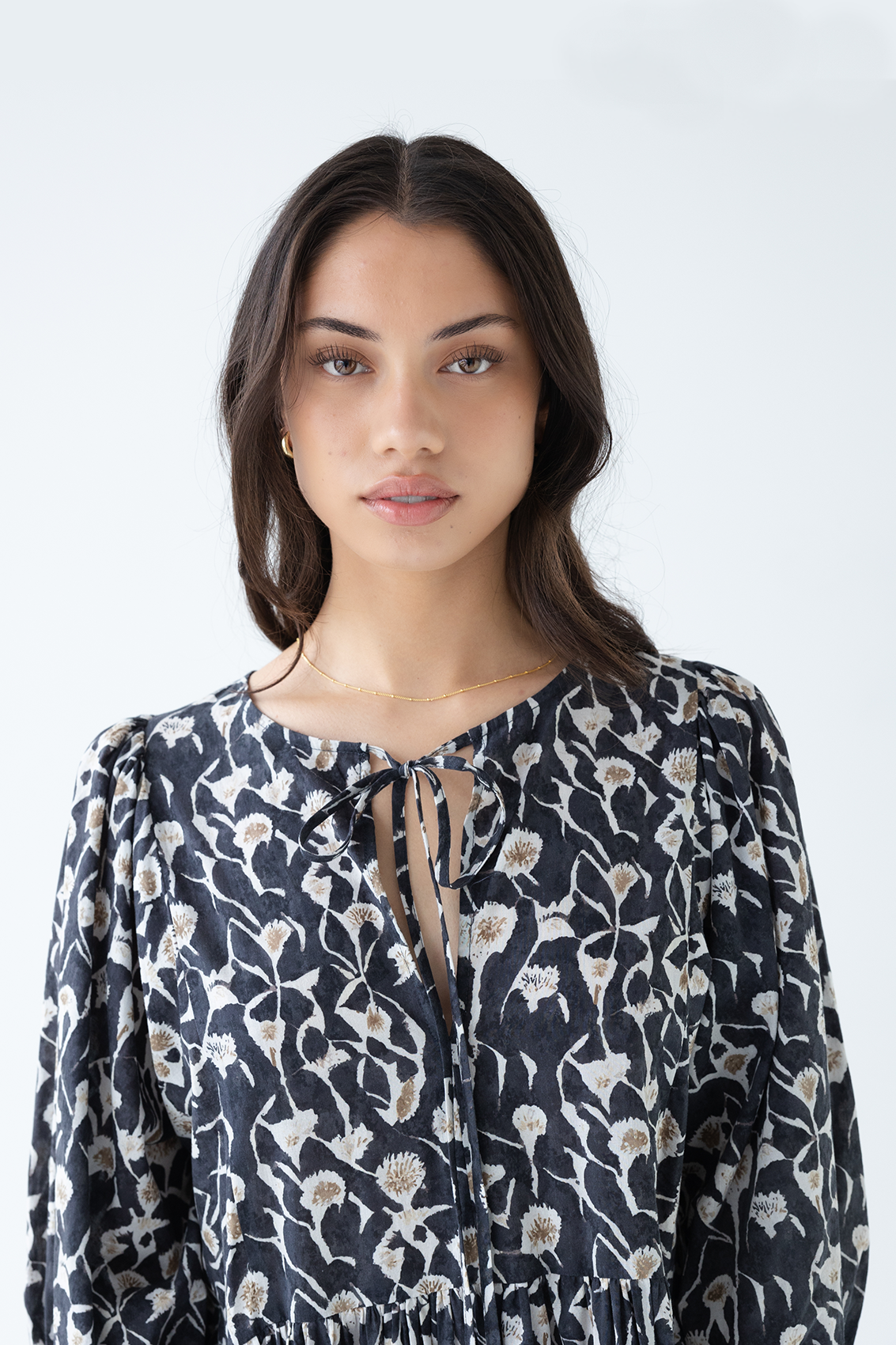 - Tie detailing at neck