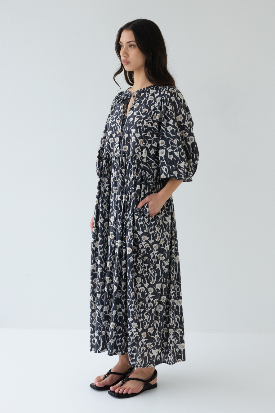 Statement sleeve midi dress with a relaxed silhouette & cute ties. Throw on & go. Pockets of course.