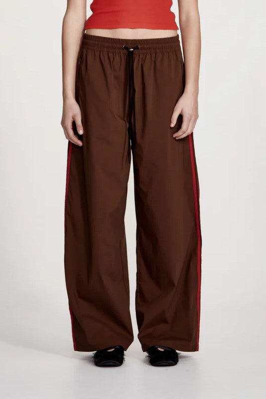 Cocoa brown colour with athletic-inspired contrast side stripes in red