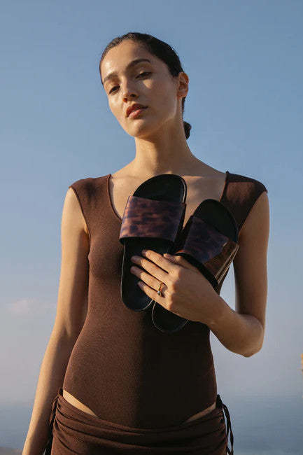 A sculptural platform slide, grounded in ease and defined by an artful animal-print strap. Features a wrapped leather platform and printed leather strap.