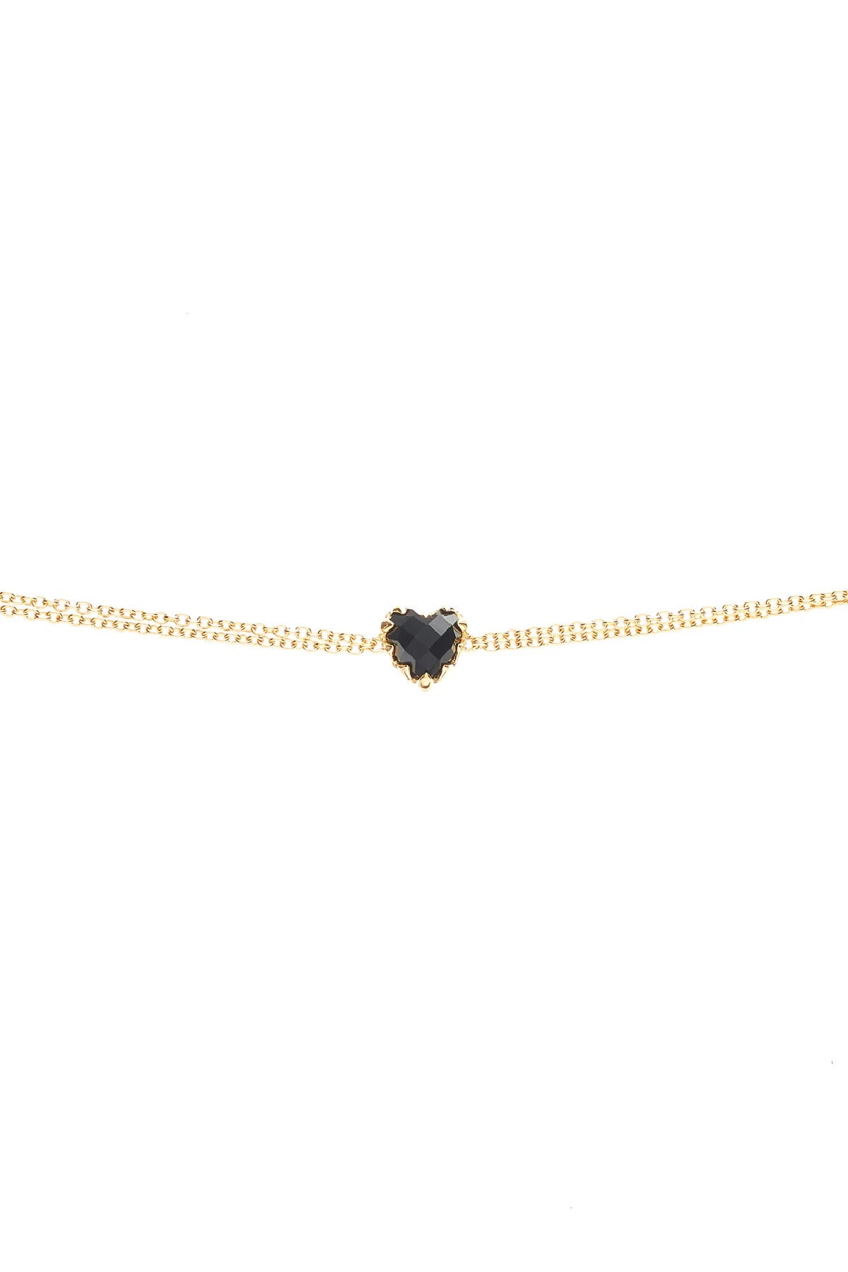 This delicate bracelet features a heart-shaped, checkerboard cut onyx stone, suspended between fine chains and secured in a claw setting. Made from a solid sterling silver base and coated in 1.5 microns of lustrous 18k yellow gold.
