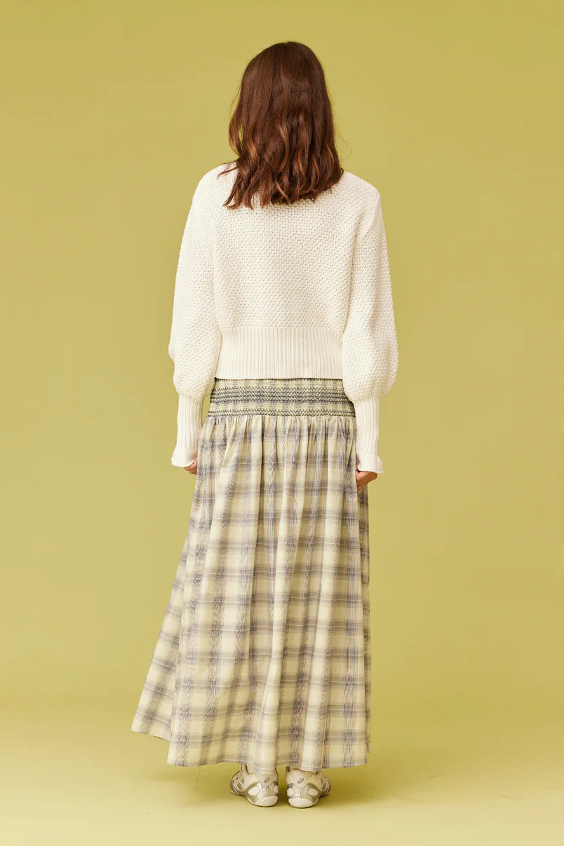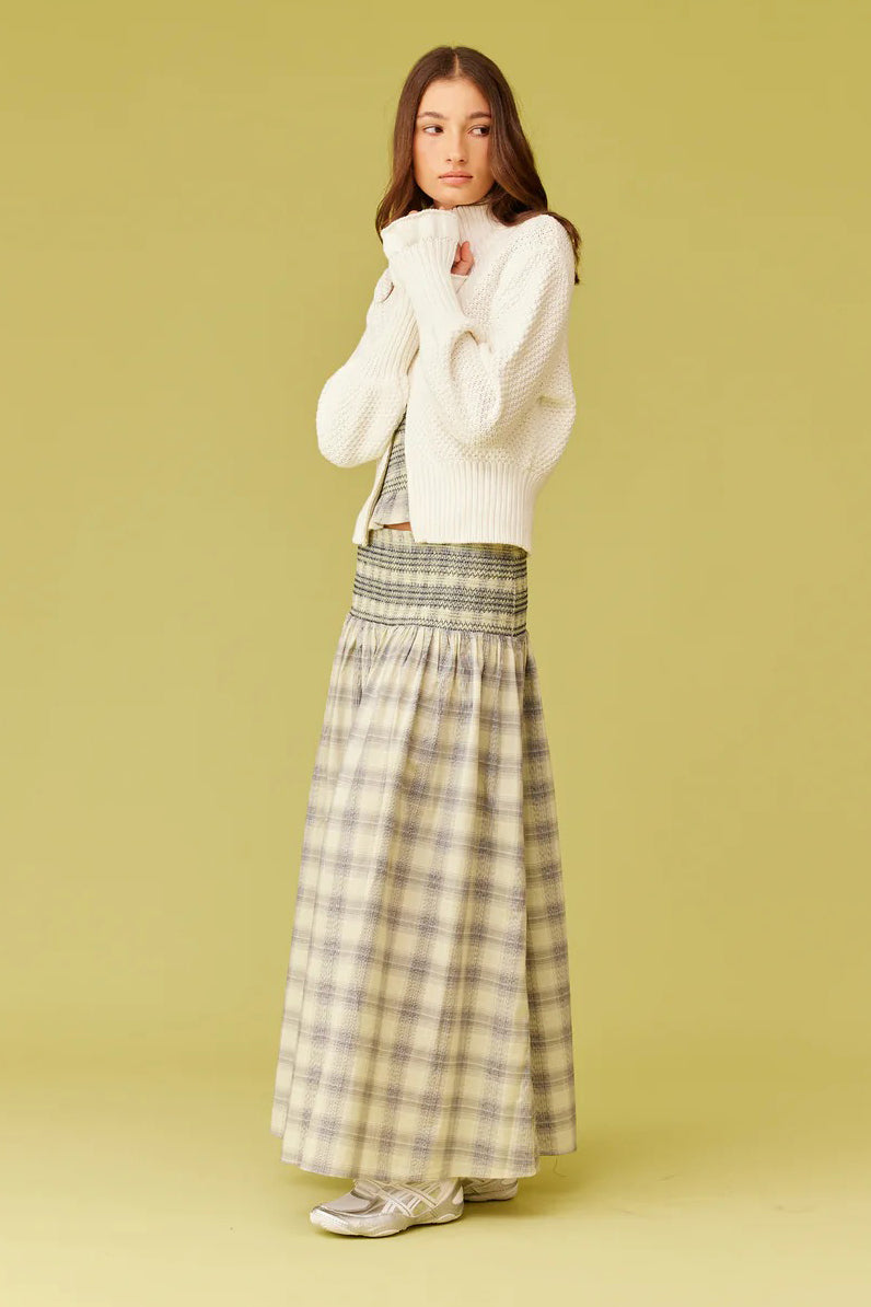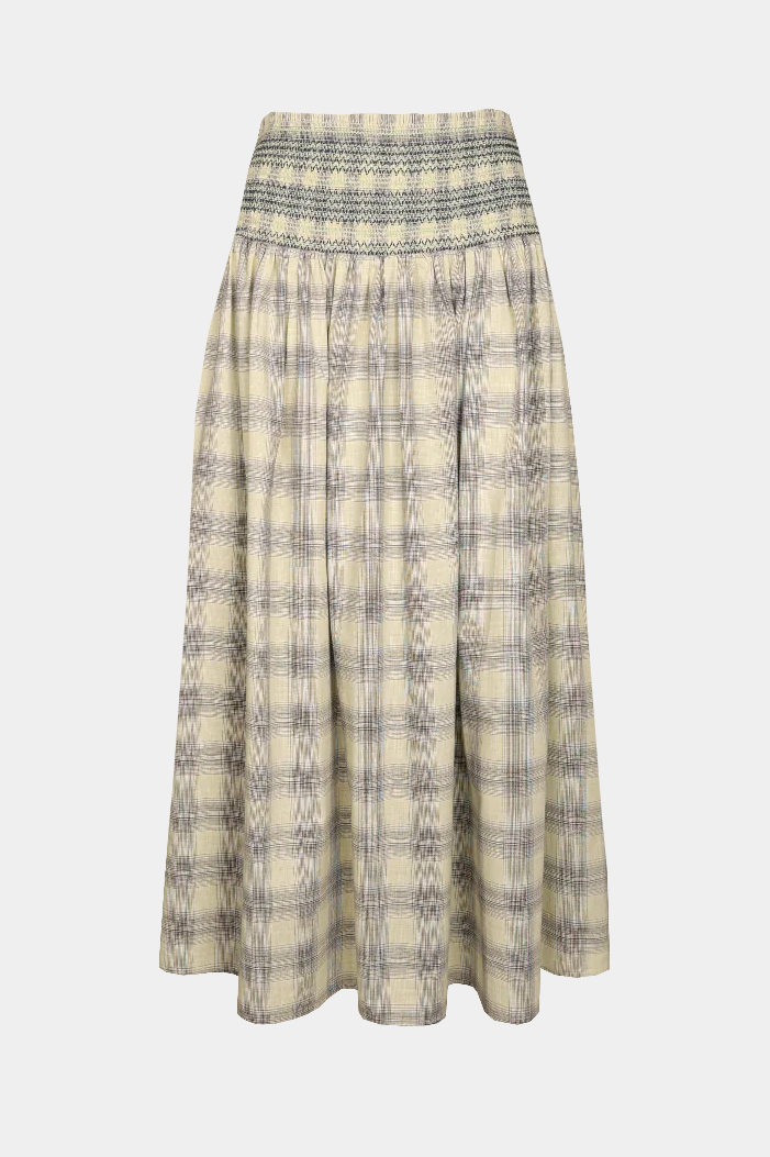 Cotton maxi skirt designed in a soft and buttery sage tartan, with shirred waist and hip, that falls to a floaty, full skirt. This skirt can be worn as a pop of print paired with a neutral top, or make it a set by pairing this skirt with RUBY's Anastasia Tank.