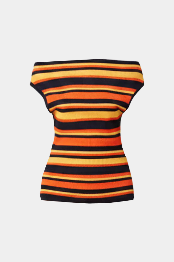 Off-shoulder knitted top crafted in a mid-weight striped knit. This top is simple yet elegant and can be worn on or off the shoulder.